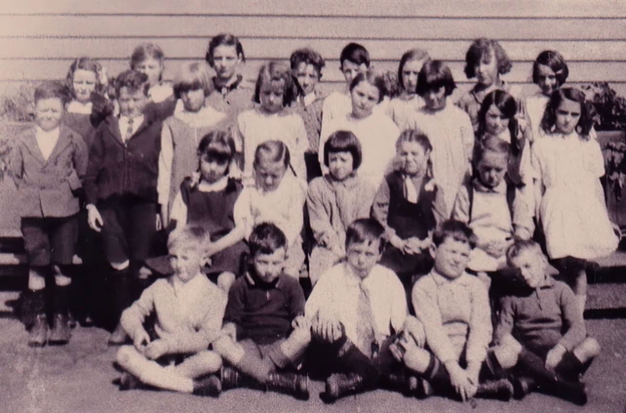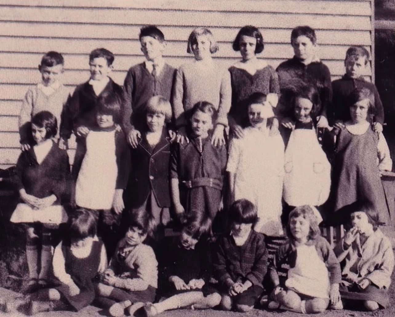 Lila Qualtrough on the Left, and sister Maude (Mollie Qualtrough, 4th from RightJack Qualtrough in the Left of Photo at Mologa State School 1927