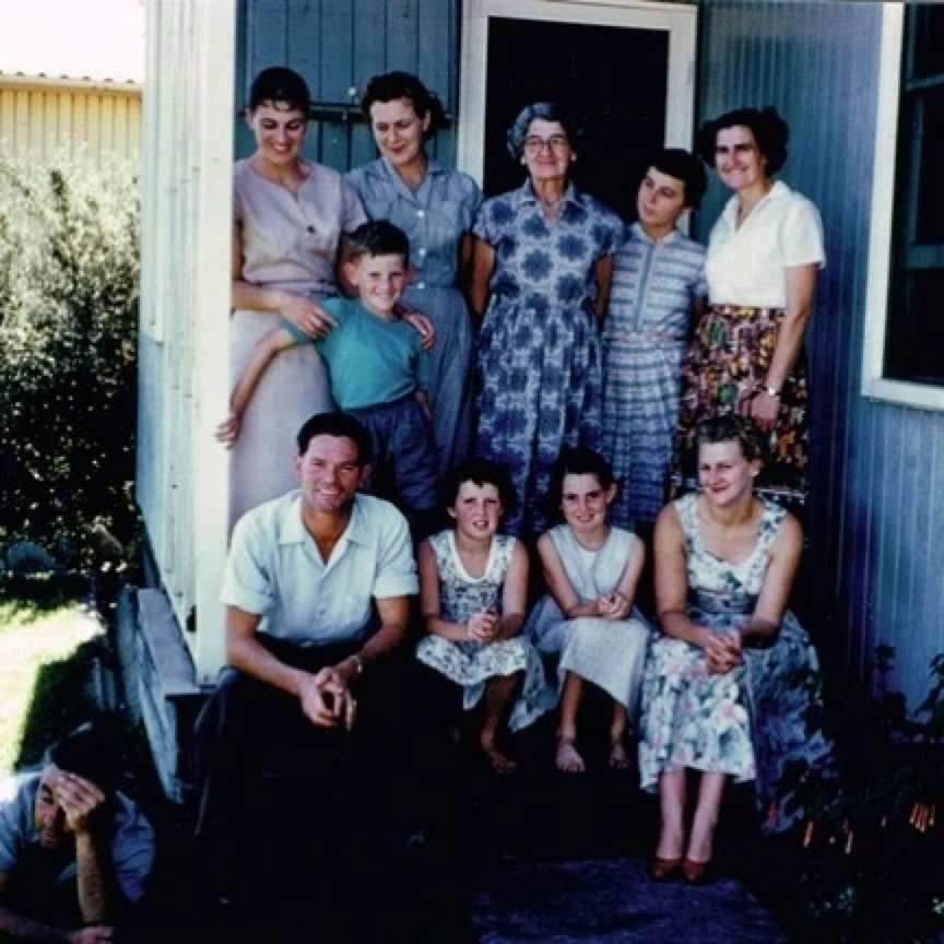 Back Row: Margaret (Qualtrough) Mathers, Malcolm Qualtrough, Molly (Qualtrough) Burke, Elsie (Powell) Qualtrough, Lynette Burke, Lila (Qualtrough) Fuller; Front Row: Mick Burke (on ground), Roy Furness, Susan Furness, Joy Marie Fuller, Nina (Qualtrough) Furness at the Burke's house in Sunshine, Victoria in about 1958