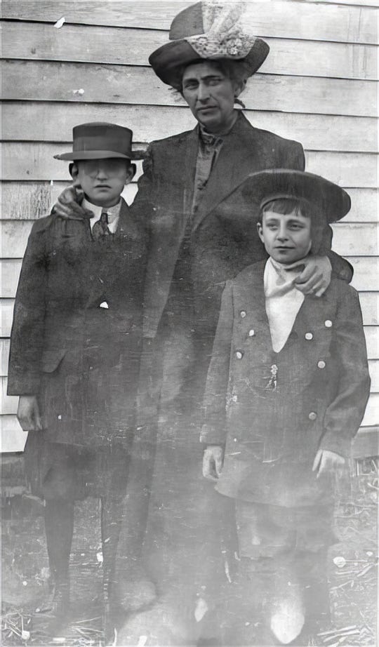 Left: Eliza Annie Qualtrough Eastham with her sons Harold (left) and Arthur.