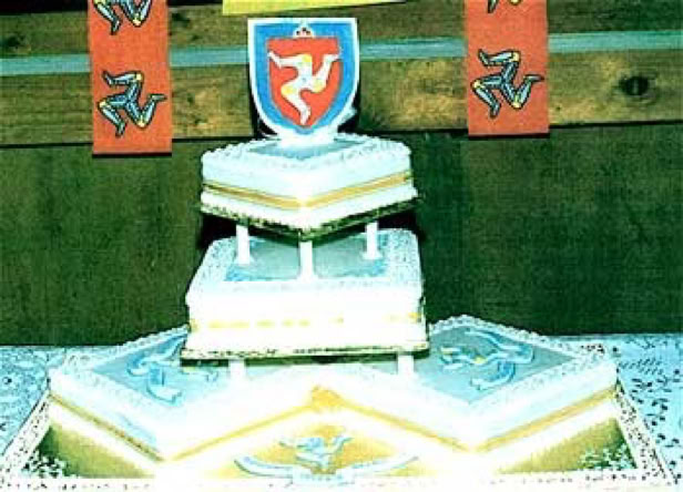 Made by Mrs Lil HADDOCK of Karamu, near Hamilton, New Zealand.This beautiful cake in white with blue and red trim was a highlight of the Reunion. To emphasise the Manx connection, Lil had decorated the cake with the Three Legs of Man symbol.