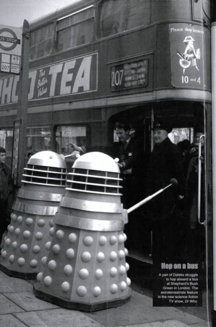 When recording was complete, we all moved to BBC-2 studios. On the trip to the bBC I wondered if I would be able to see a Dalek Shell that actors climbed inside, and had to control it to create 'this TV monstor'; or else some sic-fi artefacts from the series.