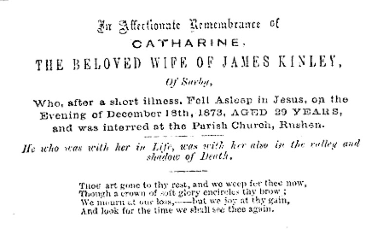 THE BEREAVEMENT CARD sent to members of the family upon the demise of CATHERINE (QUALTROUGH) KINLEY at Rushen, Isle of Man, on 18 December 1873.