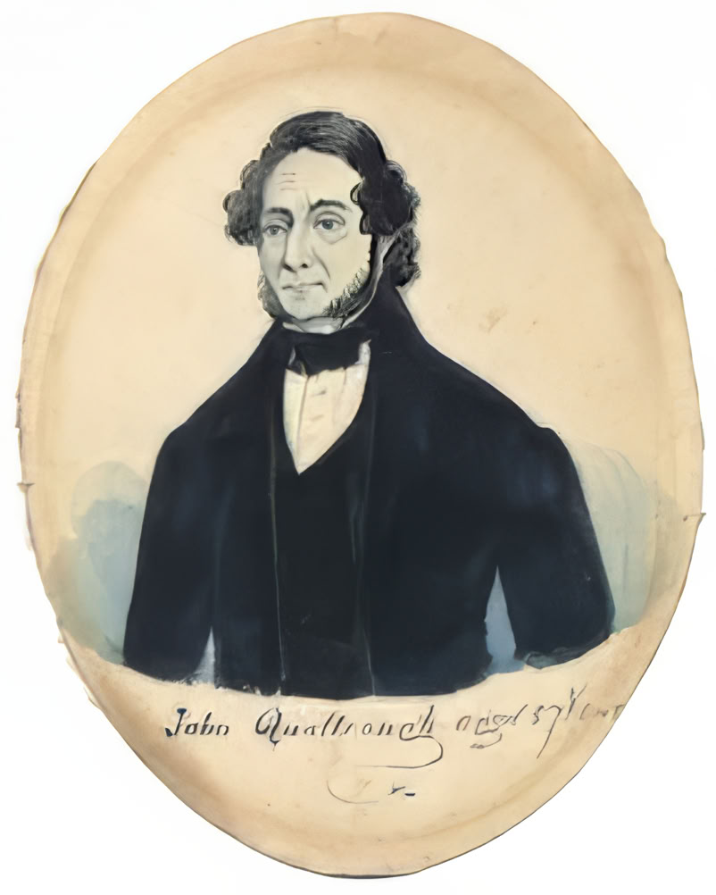 One day when my mother and I were talking the conversation turned to the two small watercolour portraits which hang on her lounge wall and are inscribed John Qualtrough aged 57 years and the other Margret Qualtrough (Note the spelling of Margret). I had always assumed these had been acquired by some past member of the family perhaps for decorative reasons and handed down, but what my mother then told me was to set me on a journey of discovery.