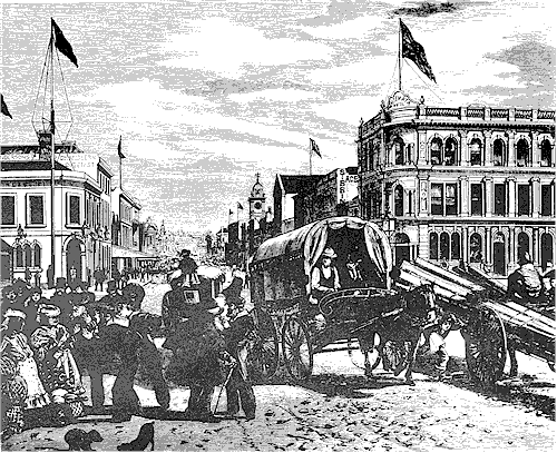 QUEEN STREET, AUCKLAND (1883). The centre of Auckland business and finance. This and other similar scenes must have been fairly familiar to the young members of the QUALTROUGH family of Pakuranga who would have often travelled into Auckland for supplies. Queen Street terminated its northern end on the city's longest wharf, which stretched 517 metres out into the Waitemata Harbour. In the foreground are a number of 'Jacks' bargaining for water melons iwth two gaily dressed women, while at right a newsboy dodges nimbly between horse and wagon.