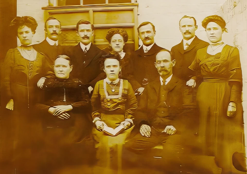 Back Left to Right: Daughter ?, John Qualtrough, Henry Qualtrough, Daughter ?, William Qualtrough, Richard James Qualtrough, Marion Qualtrough (Daughters are Elizabeth (Lizzy), and Annie)